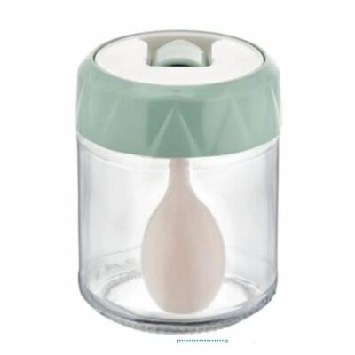Honningkrukke med grøn låg , med ske eller honningtyv