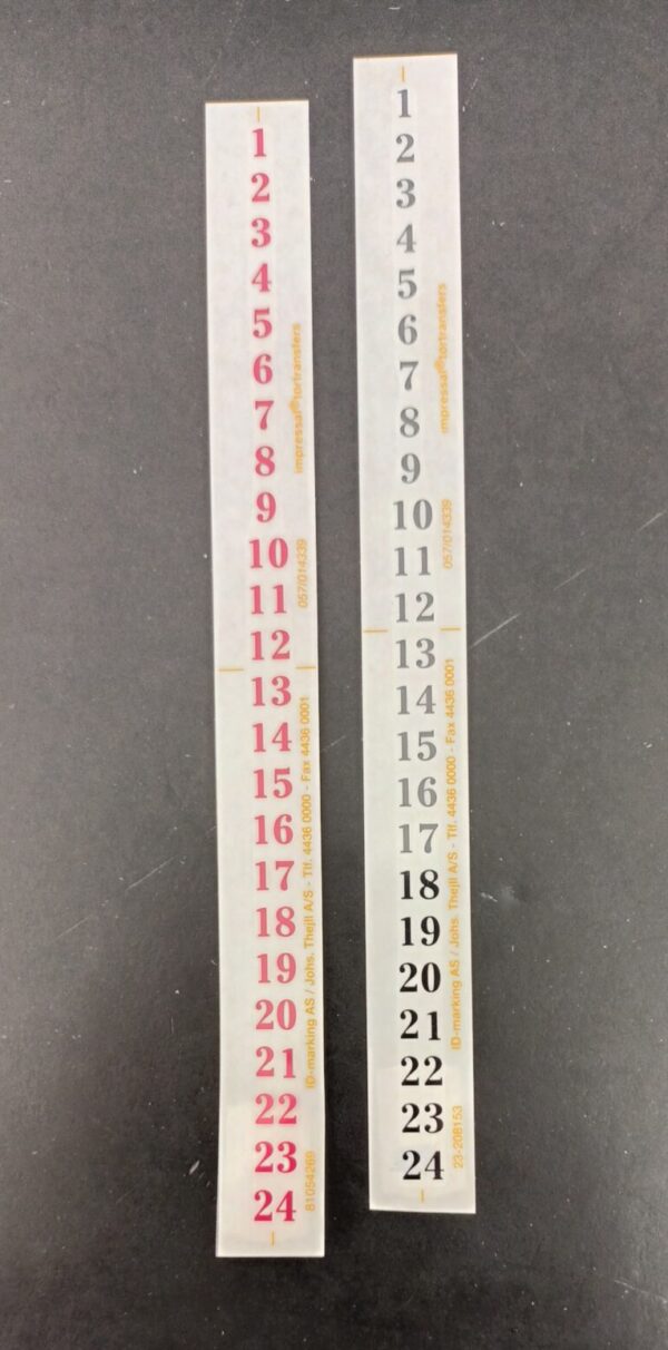 Fjern den hvide bagside af strimlen. Læg herefter talrækken på stearinlyset. Gnid med en negl over tallene og løft derefter forsigtigt overstrimlen af, når du kan se, at den har løsnet sig, og at tallene sidder på stearinlyset.
